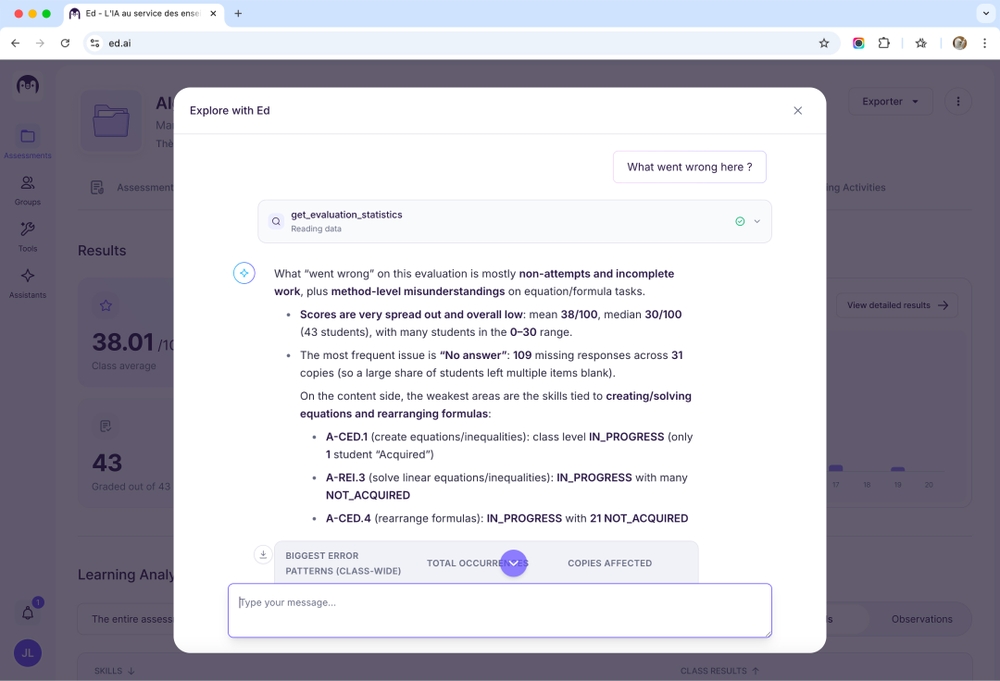 Meet your new teaching assistant—an AI that's connected to every assessment you've graded, every misconception you've identified, and every piece of feedback you've given. Ask it anything about your classes, and get answers grounded in your actual data. Not generic advice. Real insights.