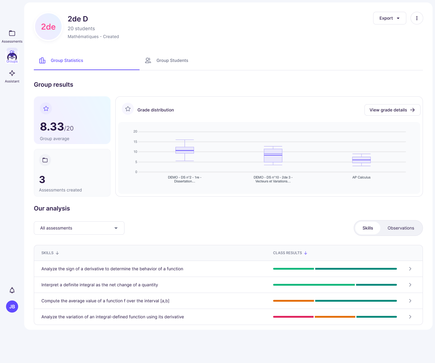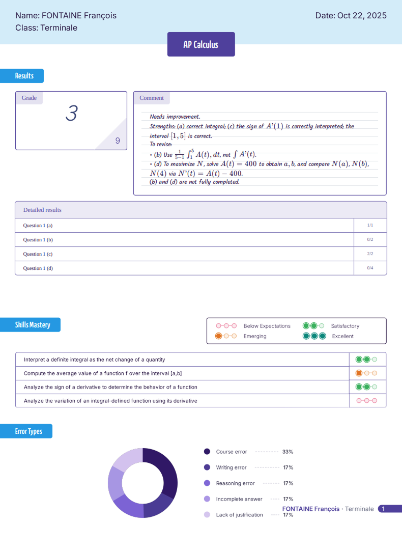 Get a comprehensive analysis for every assessment, class, or student. Instantly see grades, skill mastery, and the most common errors—so you know exactly where to focus your efforts.