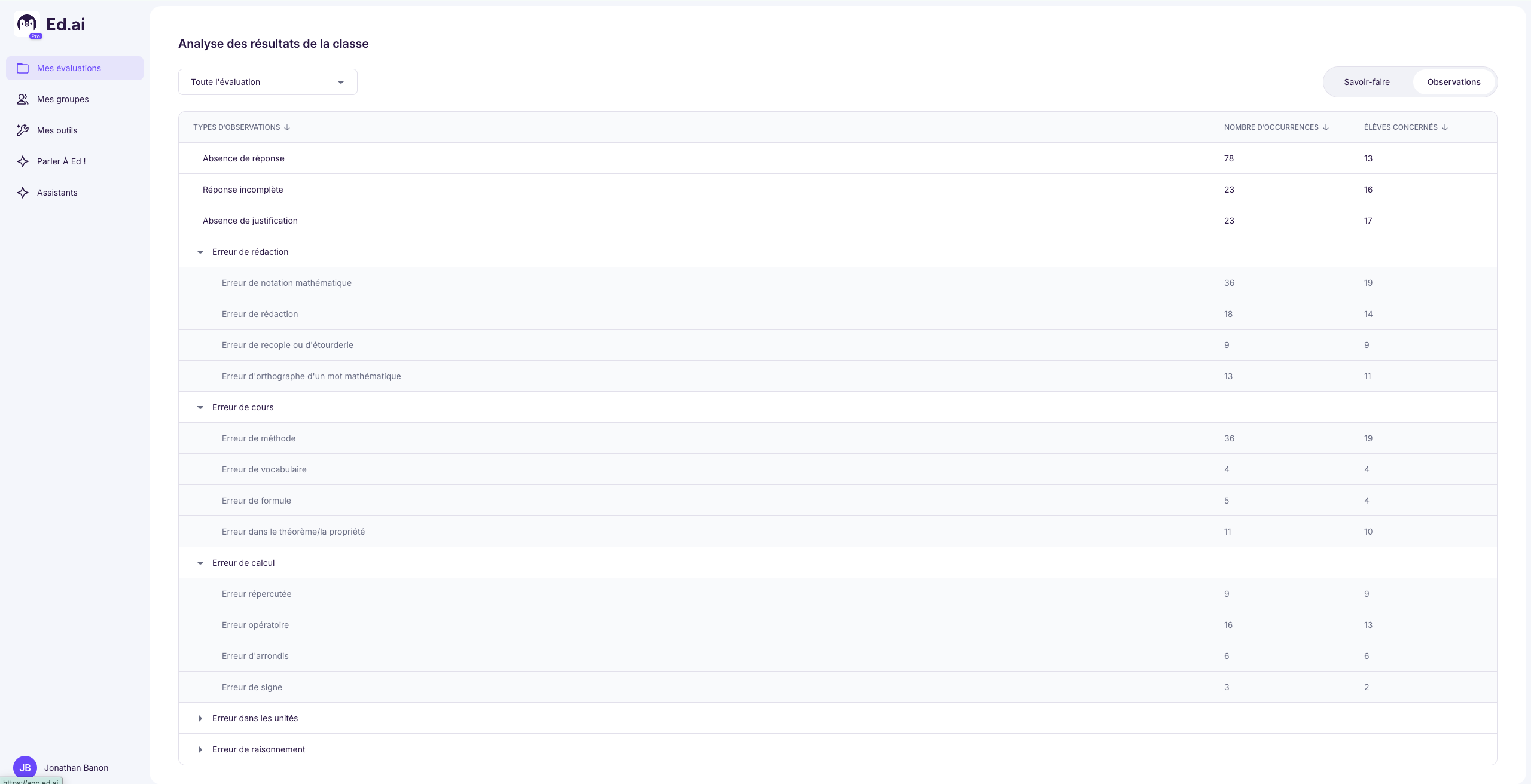 Ed.ai ne se contente pas de repérer les erreurs — il identifie leur origine. Visualisez les difficultés récurrentes de votre classe : « 12 élèves confondent l'imparfait et le passé simple », « 8 élèves font des erreurs de signe dans les équations ». Des tendances impossibles à déceler en corrigeant copie par copie.