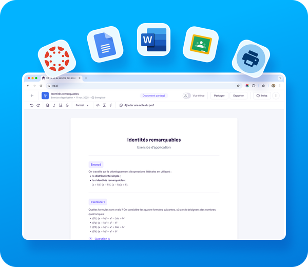 Ed.ai révolutionne votre préparation pédagogique en générant automatiquement des activités variées, adaptées aux profils et aux productions de vos élèves. Vous les récupérez ensuite dans un format 100% modifiable, pour composer librement vos séquences et personnaliser votre enseignement.